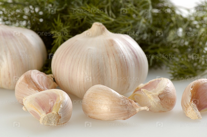 Чесночные дольки с зеленью на белом фоне