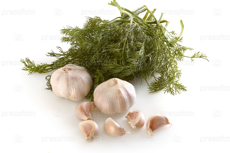 Головки чеснока и зелень на белом фоне