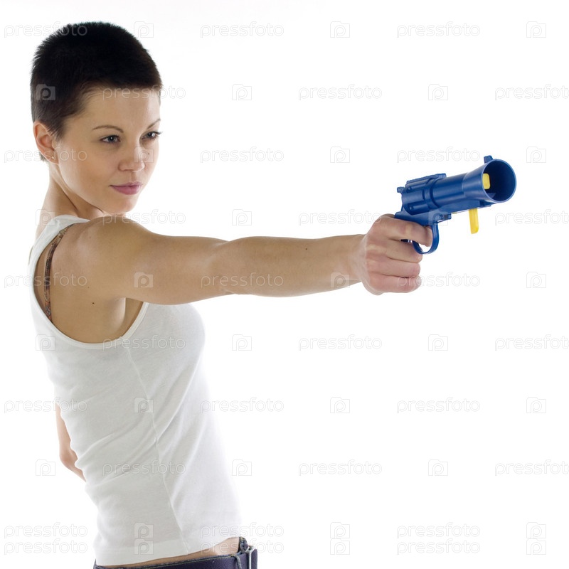 Девушка из танкового топа с темными короткими волосами держит пластиковый пистолет-игрушку