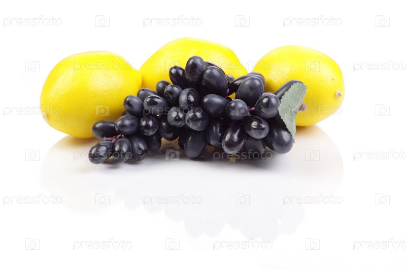 Гроздь винограда с лимонами на белом фоне