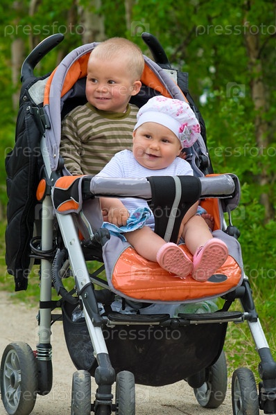 Двое детей в детской коляске. между ними разница в возрасте одного года. они брат и сестра