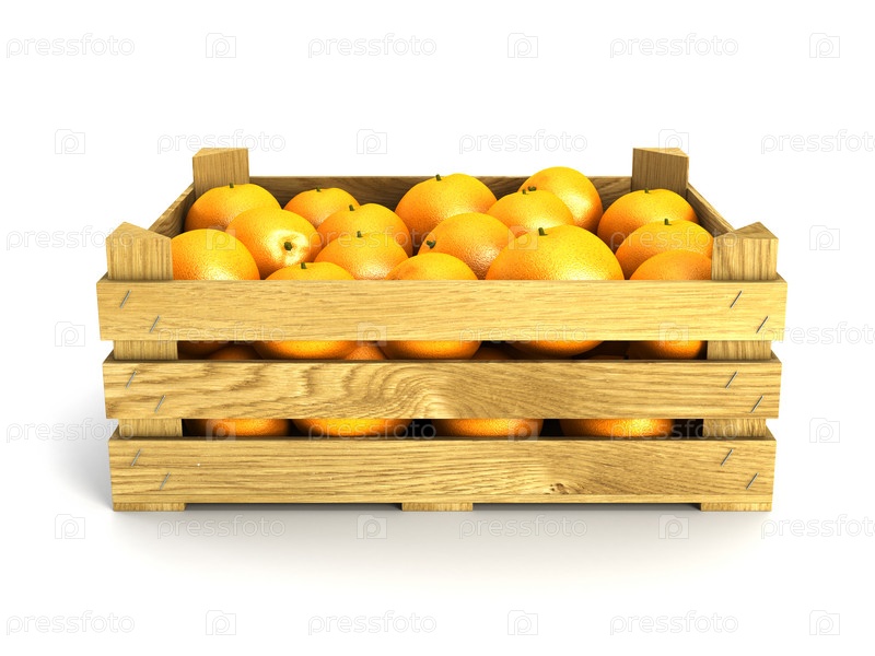 Деревянная коробка с апельсинами, изолированная на белом. 3D