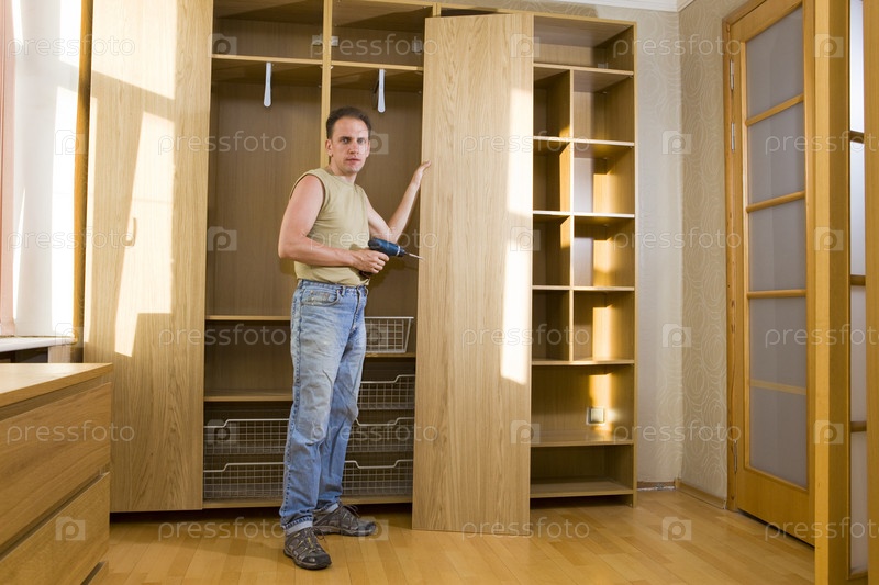Мужчина занимается сборкой мебели