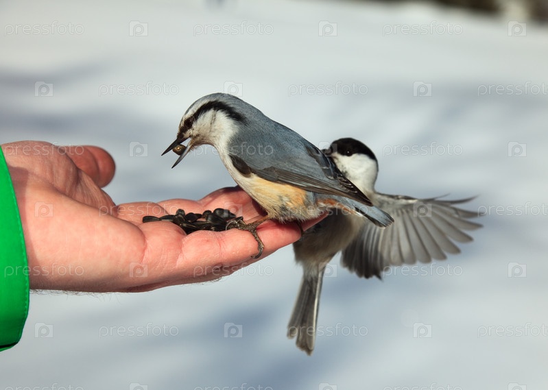Поползень и синица на ладони