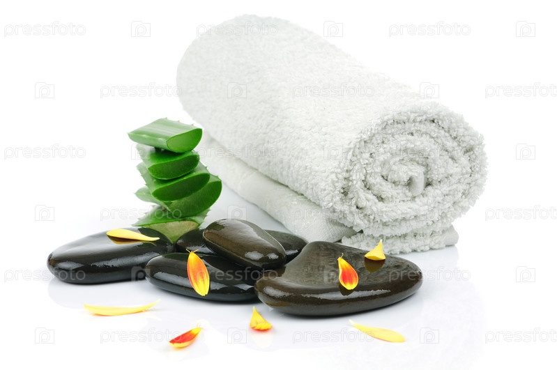 Концепция СПА: листья алоэ, галька и полотенце