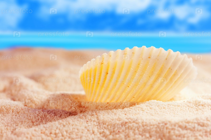 Морская раковина лежит на песчаном пляже