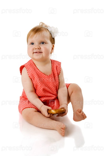 Рыжеволосая маленькая девочка с печеньем в руках, изолированная на белом фоне