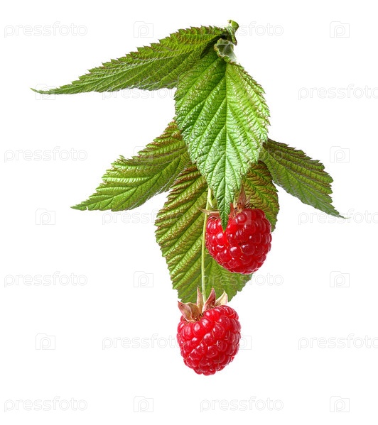 Малина с зелеными листьями на белом фоне
