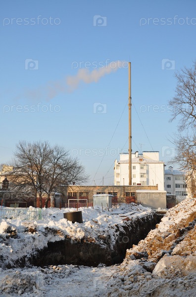 Зима. Котельная. Ремонт теплотрассы. Россия
