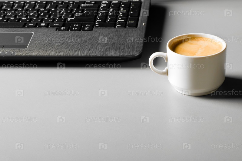 Чашка кофе рядом с ноутбуком на столе