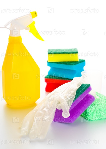 Комплект мокрой чистки с желтой бутылкой для распыления, губками и резиновыми перчатками