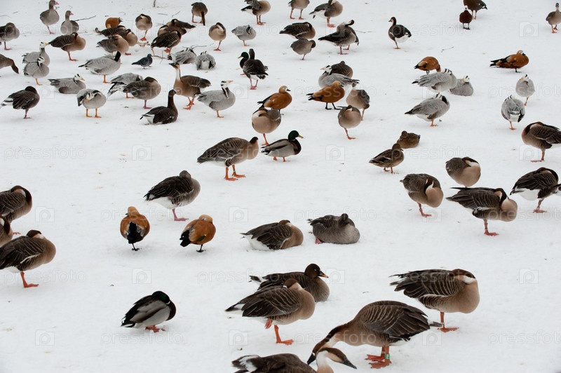 Стая птиц на снегу