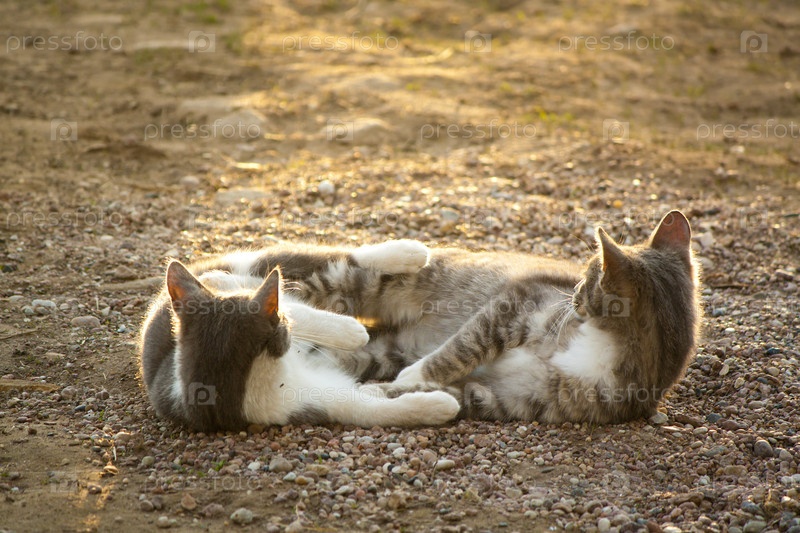 Два котенка лежат на земле