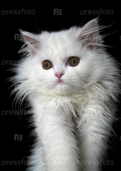 Белый пушистый кот на черном фоне