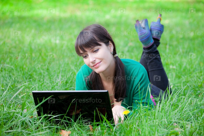 Красивая девушка лежит с ноутбуком на зеленой траве