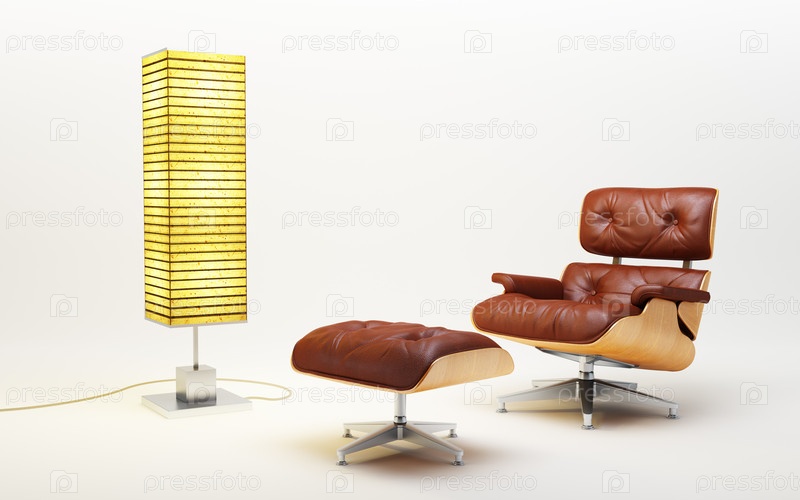 Кресло, стул и лампа на белом фоне