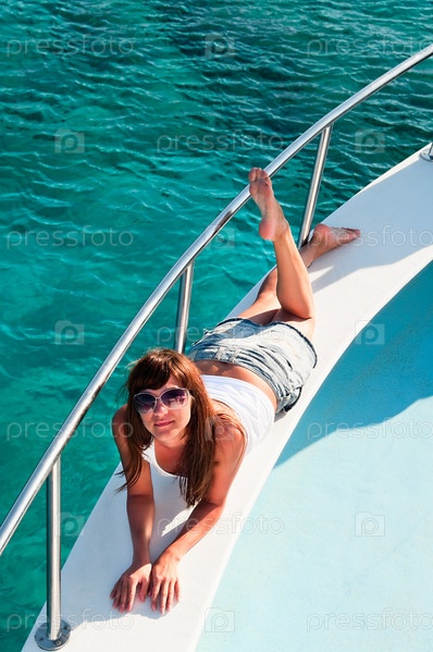 Девушка лежит на палубе яхты