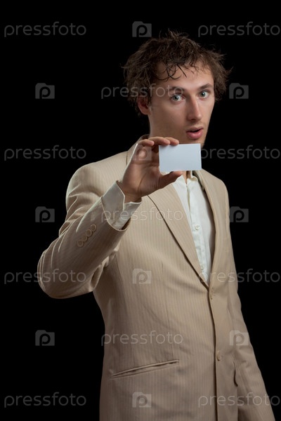 Молодой мужчина, держащий белую карточку на черном фоне