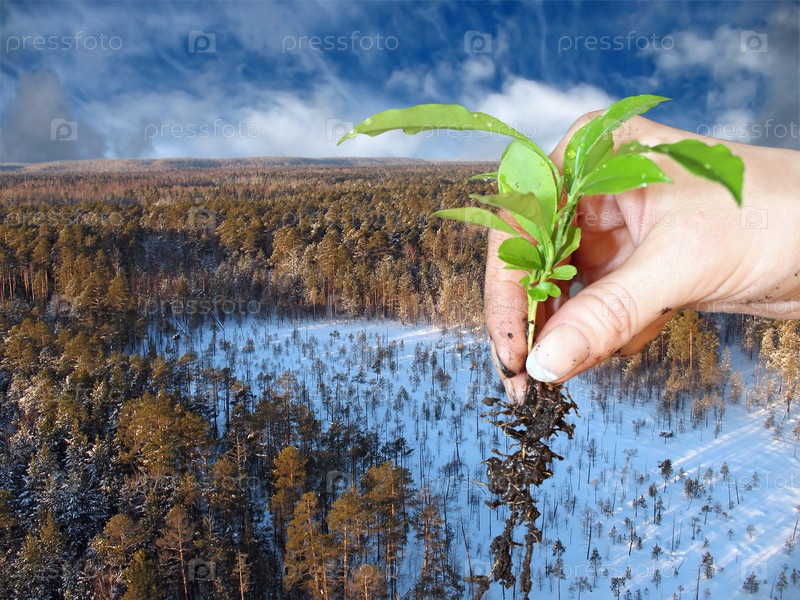 Маленькое растение на фоне дикой тайги в Западной Сибири