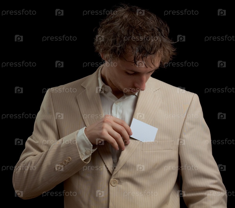 Молодой мужчина кладет белую карточку в карман пиджака на черном фоне