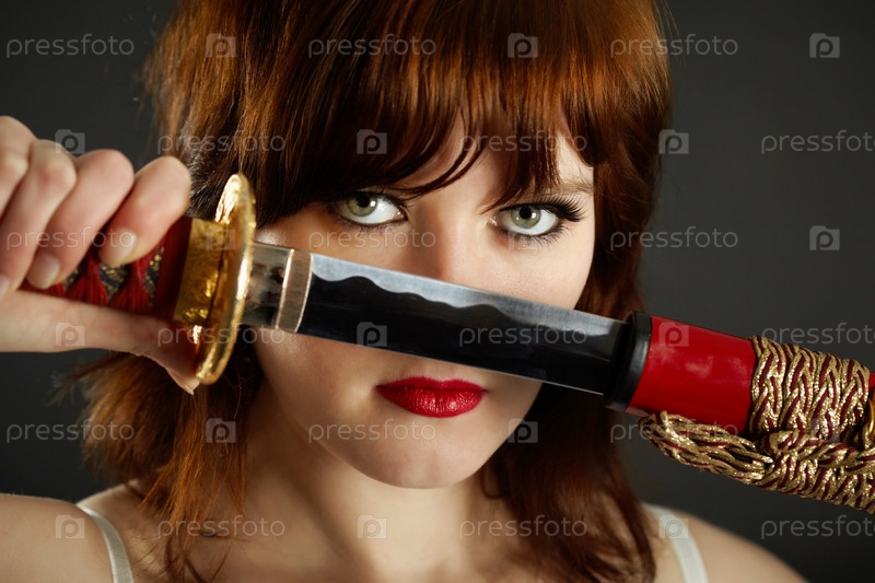Красивая молодая девушка с мечом крупным планом