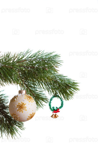Новогодний шар на еловой ветке на белом фоне
