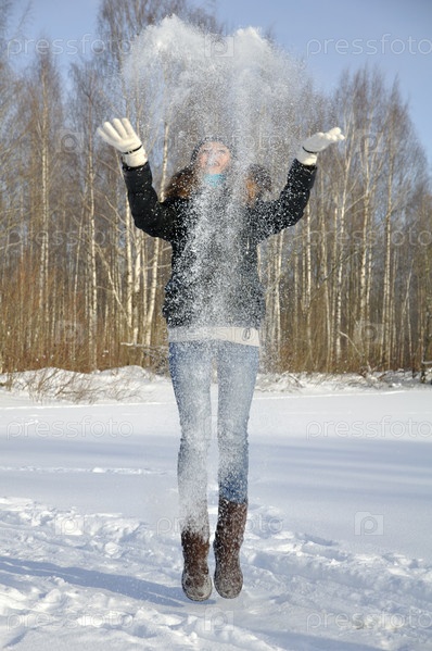 Девочка играет со снегом в парке зимой