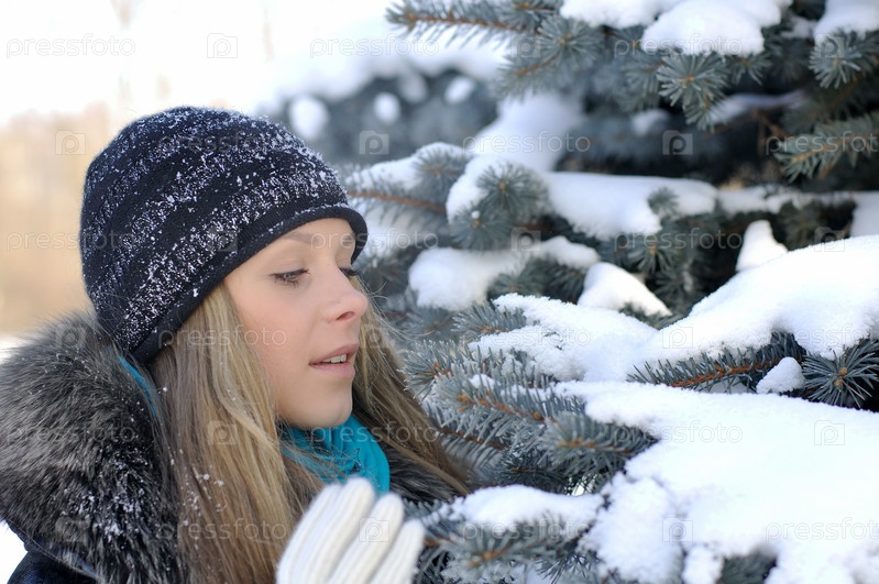 Милая девушка смотрит на заснеженные ветви ели