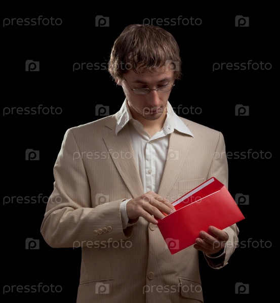Мужчина открывает красный конверт