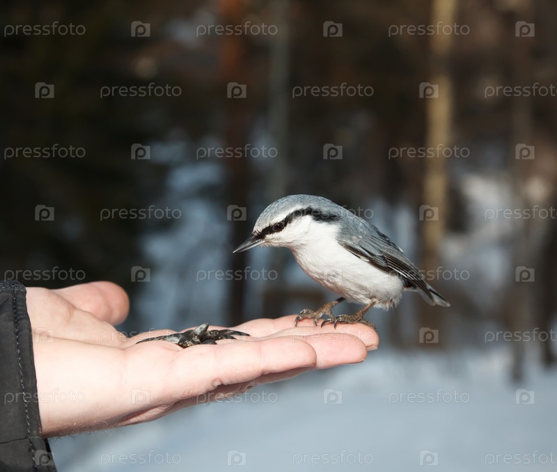 Поползень сидит на руке человека