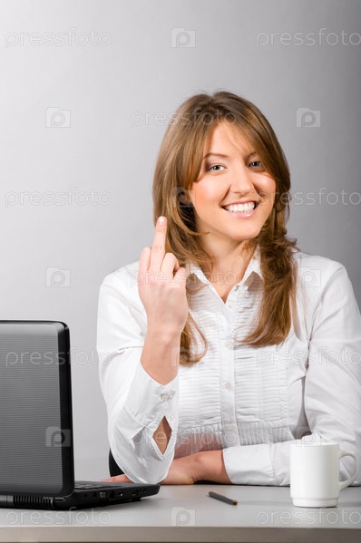 Деловая женщина сидит в офисе и показывает средний палец