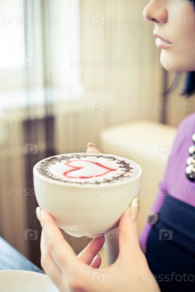 Красивая девушка сидит в кафе с чашкой кофе