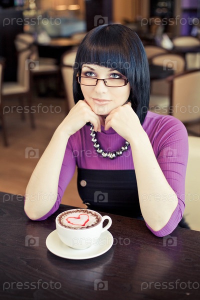 Красивая девушка сидит в кафе с чашкой кофе