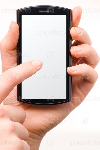 Сенсорный мобильный телефон в женских руках, на белом фоне