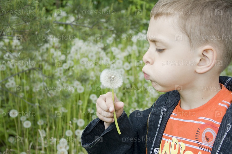 Мальчик дует на одуванчик