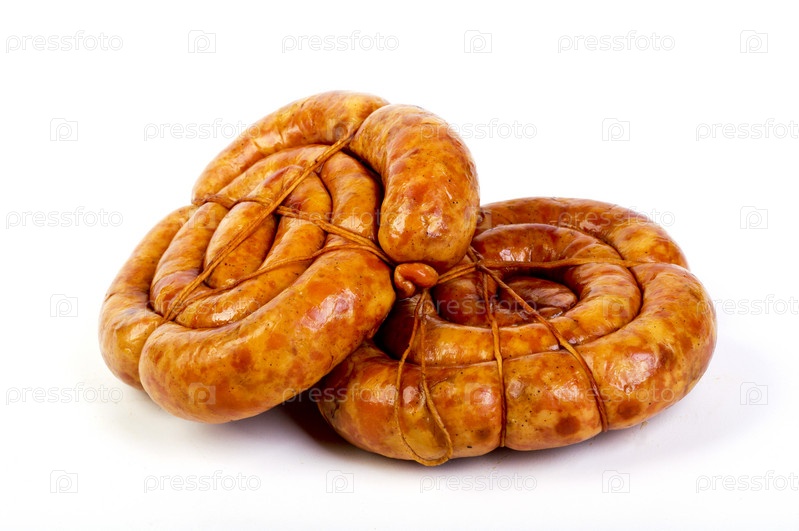 Связка колбас на белом фоне