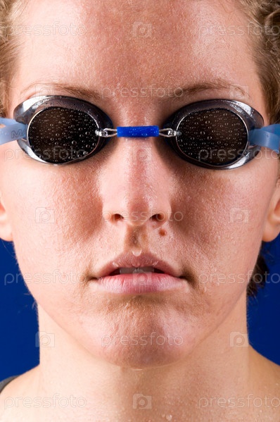 Портрет женщины-пловца в плавательных очках и с каплями воды на лице