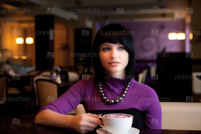 Красивая девушка сидит в кафе с чашкой кофе