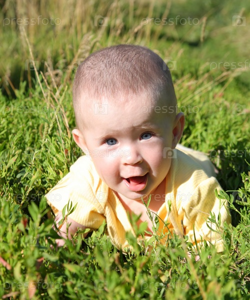 Счастливый ребенок лежит в траве