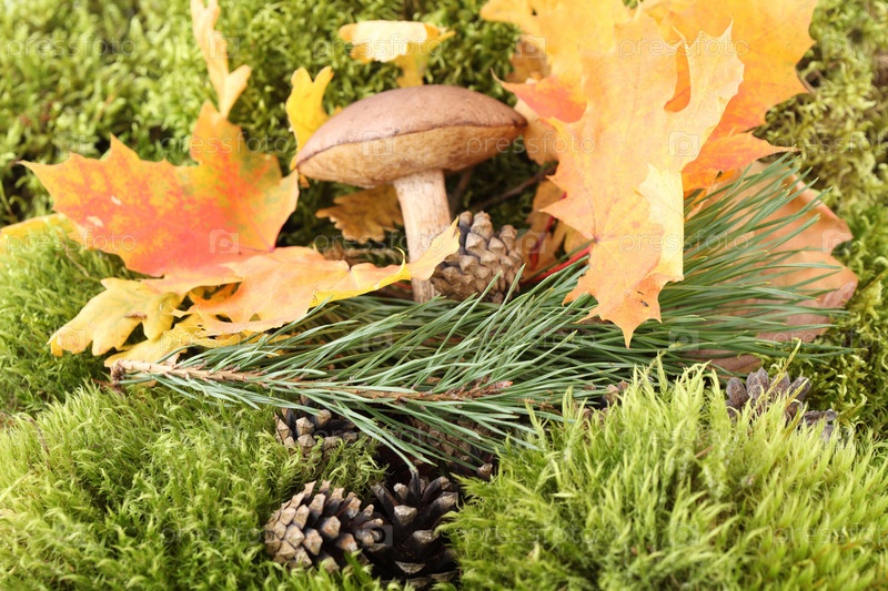 Шишки на ветвях ели, гриб и осенние листья крупным планом