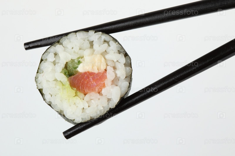 Японский ролл, зажатый палочками для еды на белом фоне