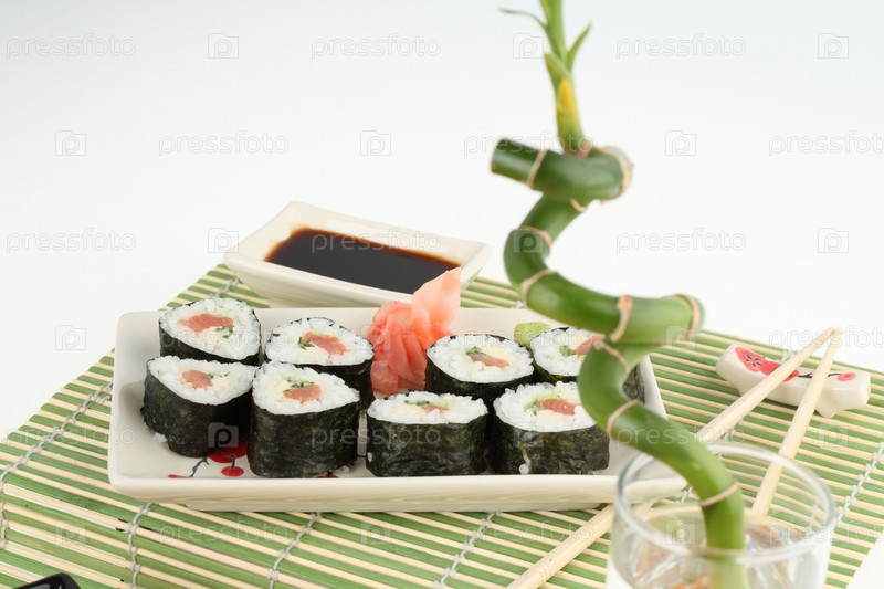 Тарелка с суши, соус и китайские палочки для еды на светлом фоне