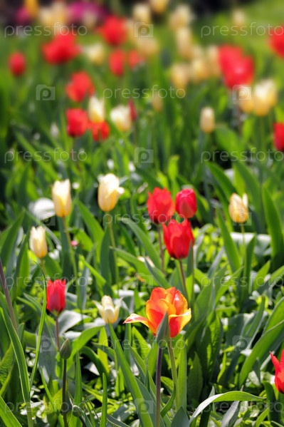 Клумба с яркими тюльпанами крупным планом