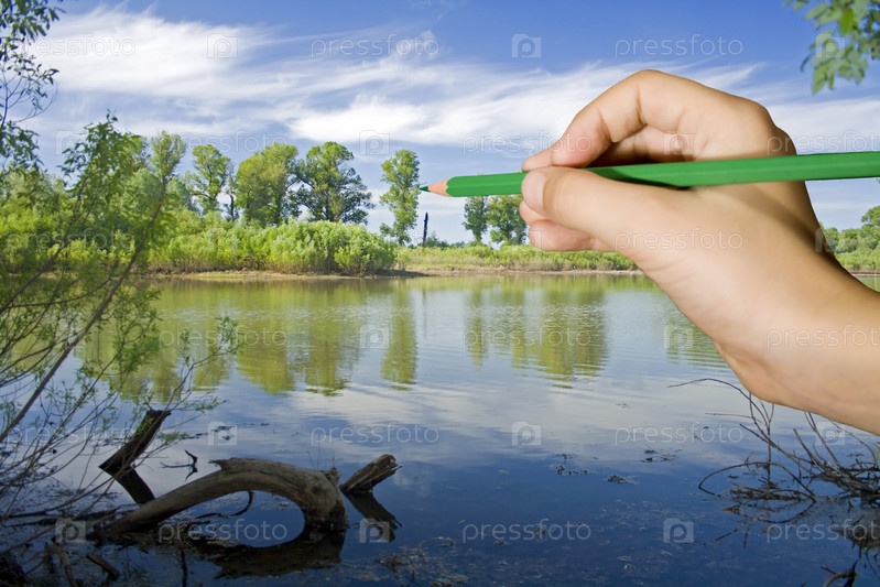 Детская рука с зеленым карандашом на фоне летнего пейзажа