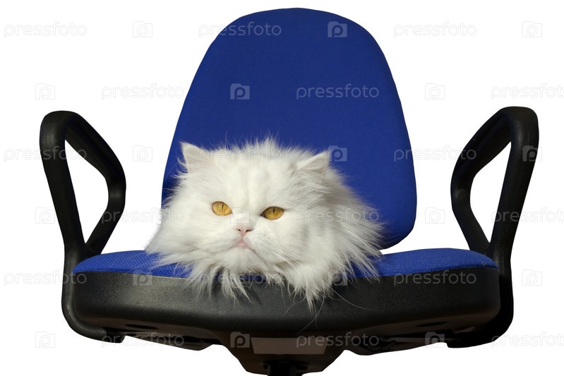 Белый кот, лежащий на синем офисном стуле