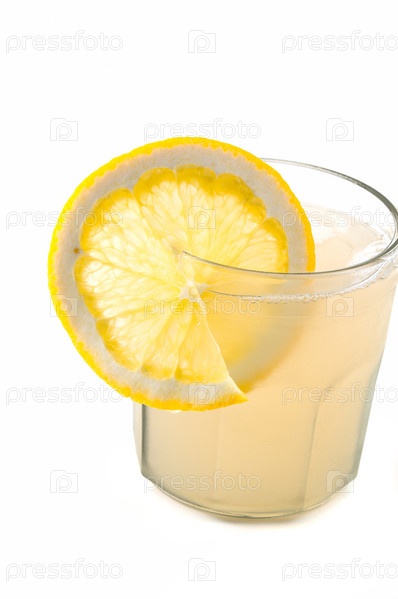 Стакан яблочного сока с долькой лимона на белом фоне