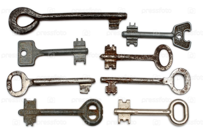Восемь старых ржавых ключей на белом фоне