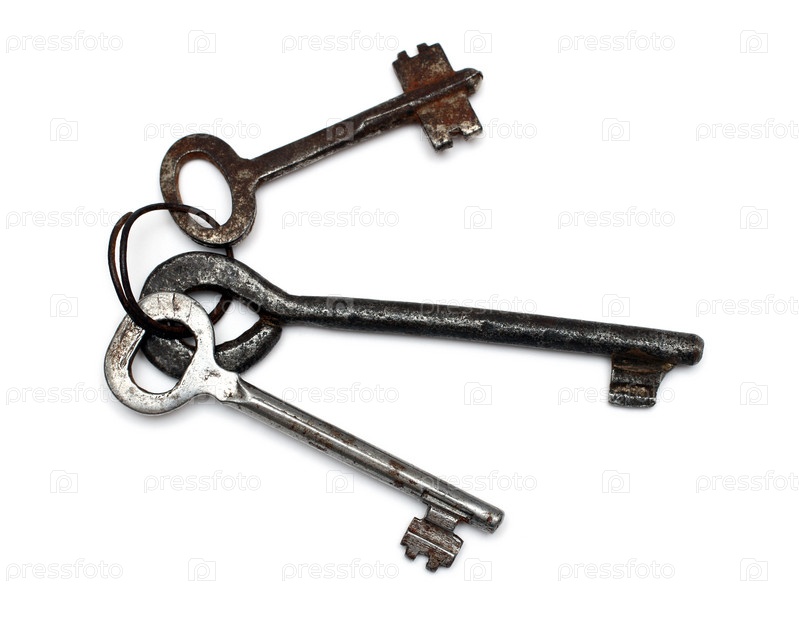 Связка трех старых ржавых ключей на белом фоне