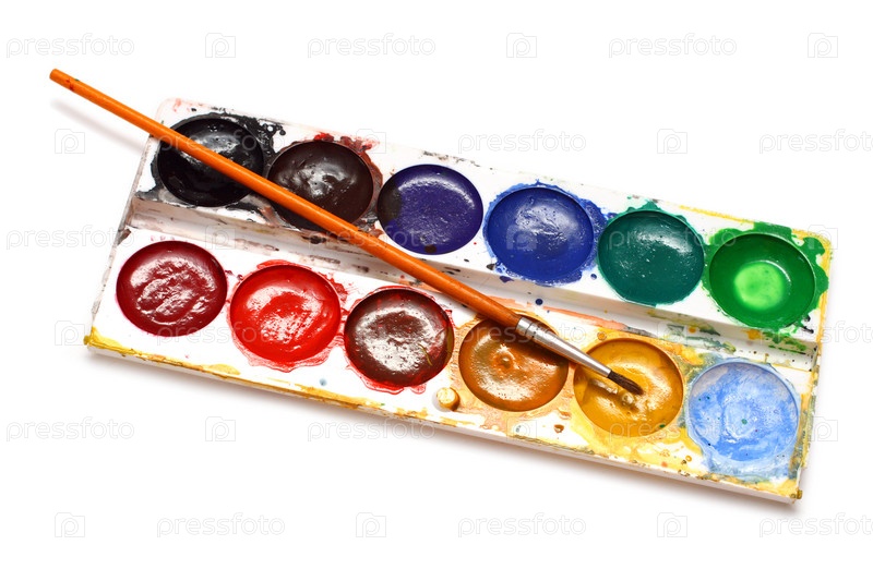 Акварельные краски и кисть на белом фоне