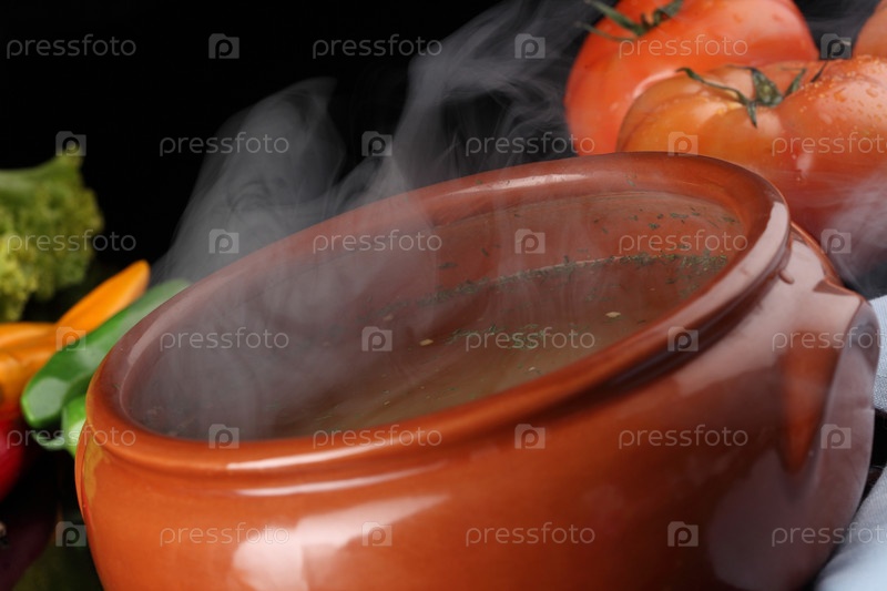 Горячий суп в керамическом горшочке